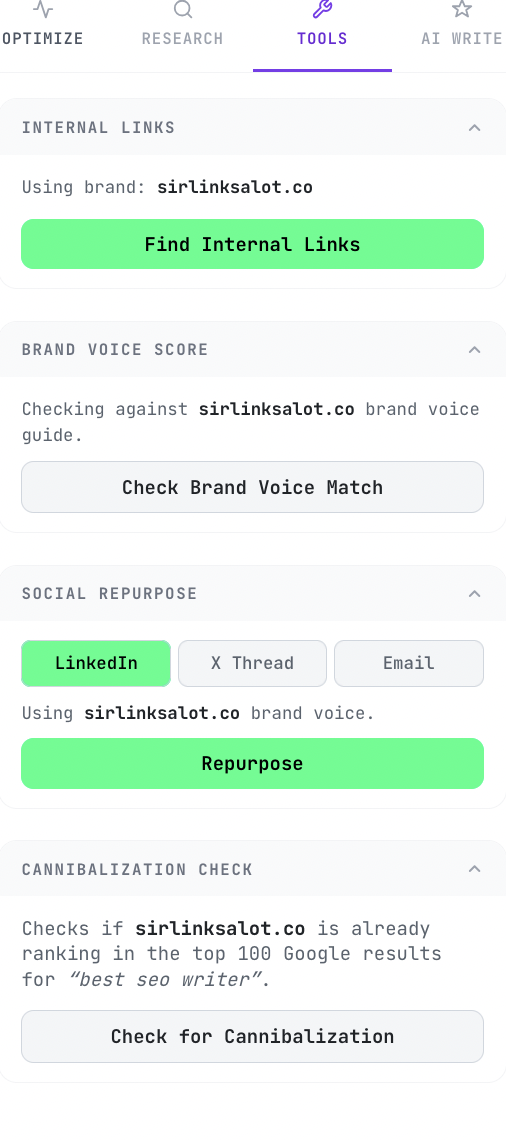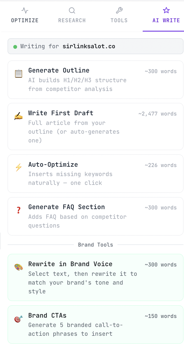 Seven AI writing modes built with your keyword and competitor data already loaded — plus a full brand voice system that learns how you write and keeps every article on-brand.