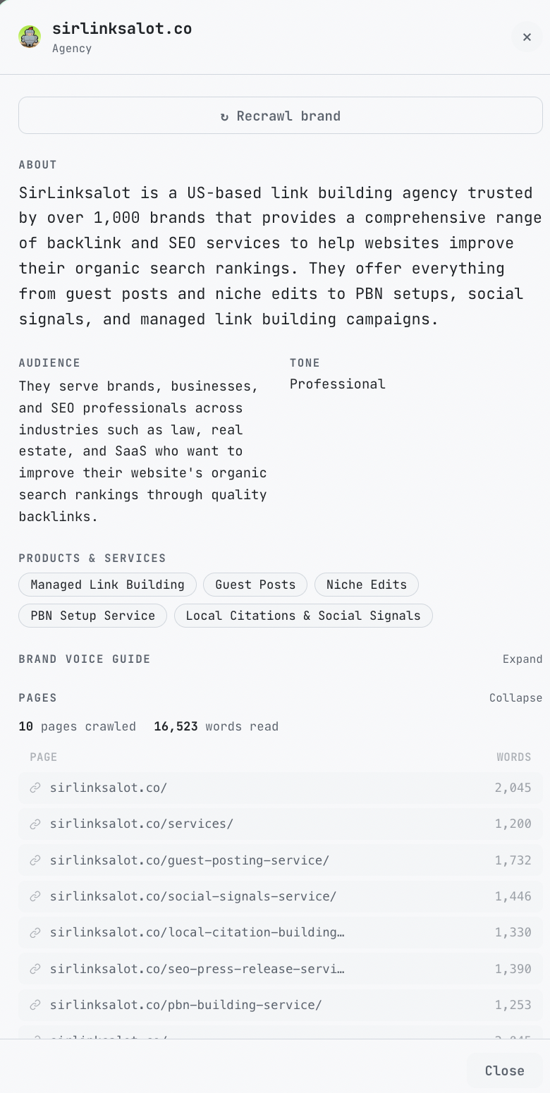 The crawler extracts the actual written content from your live pages and builds a brand voice profile from it. Tone, sentence structure, vocabulary, formality level — all learned automatically from what you've already published.
