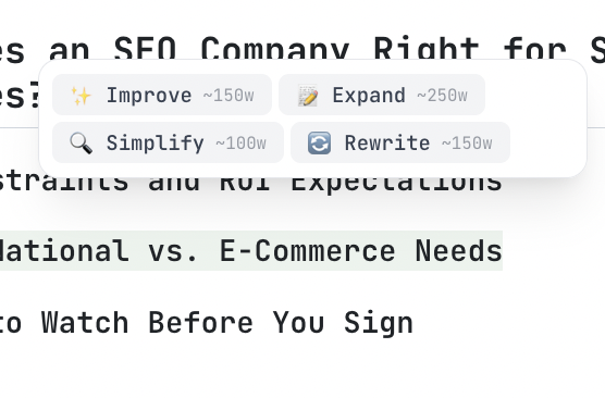 The inline AI understands the context of your full article, not just the selected text. So rewrites stay on-topic, expansions don't repeat what you've already said, and simplifications keep the core meaning intact.
