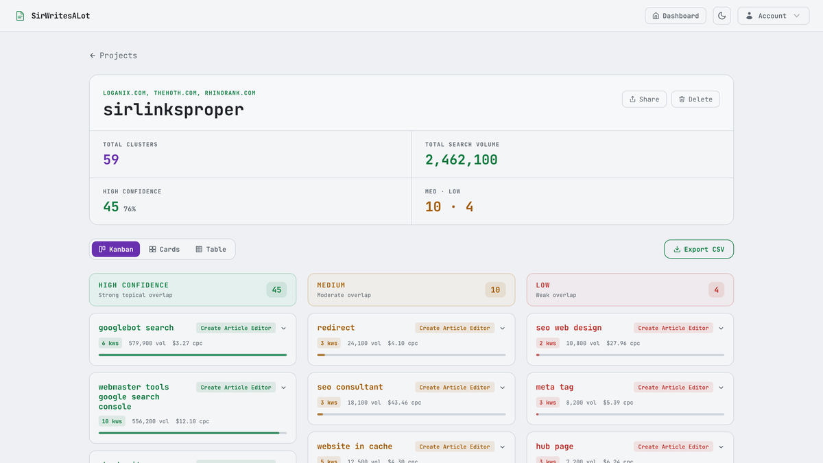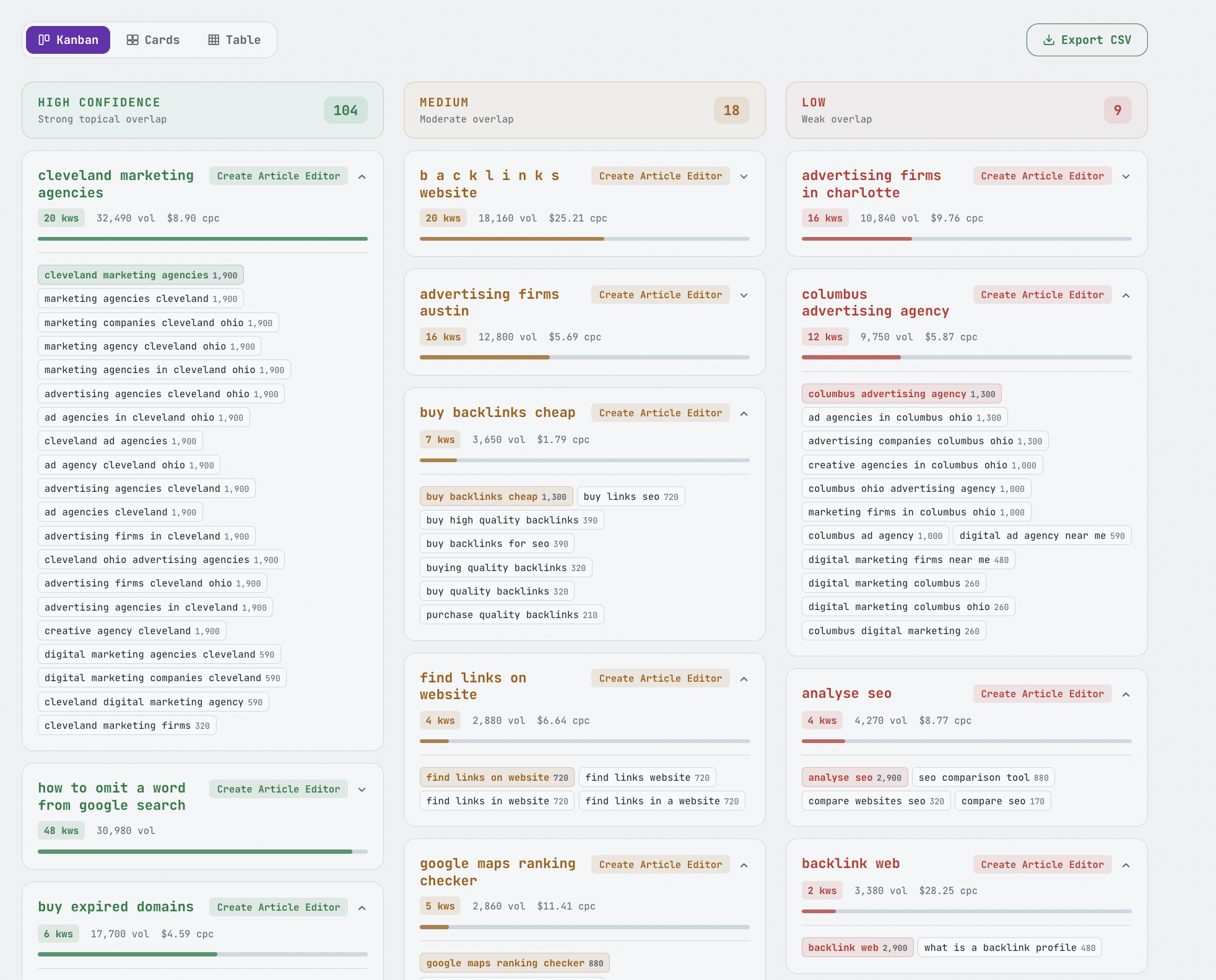 Exports include all cluster names, keywords, search volumes, difficulty scores, and SERP overlap data in a clean format. Use it to build a content calendar, brief writers, or present a keyword strategy to a client.