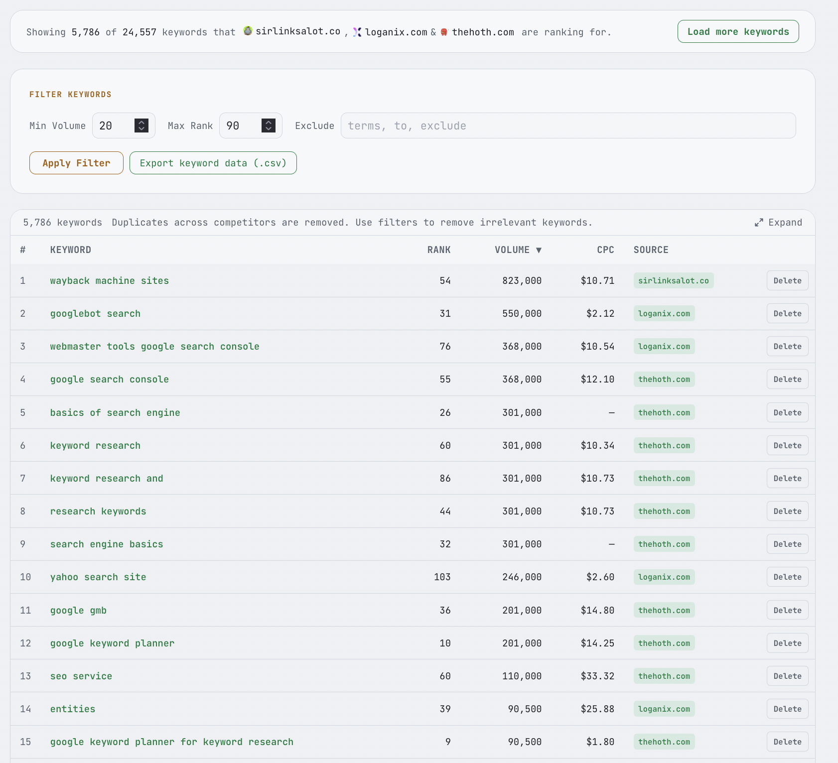 We query live ranking data for the domain you enter and return hundreds or thousands of keywords with their positions, search volume, and difficulty. It's the fastest way to reverse-engineer a competitor's entire content strategy.